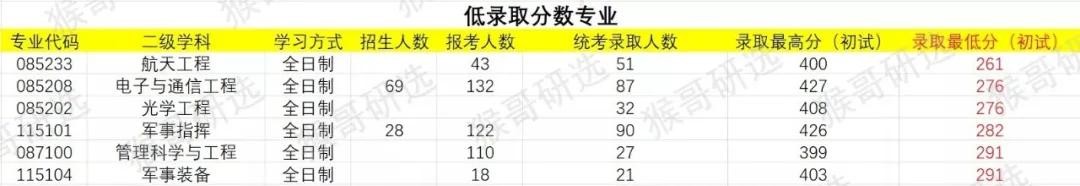 反观录取线偏低(录取最低分)的专业,其中全日制的航天工程为261分;国防科技大学录取专业均为总分500分,其中最高分和最低分的分值差距均在100分以上,电子与通信工程的分差高达151分。