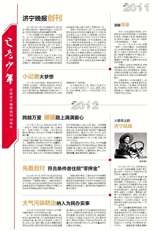 2011年9月16日,济宁晚报创刊,成为市民了解这座城市一道崭新的窗口,也成为市委、市政府传递民生声音的重要传声筒。2012年2月15日,全市各级各类医疗机构开始对符合条件的患者全部实行先看病后付费的诊疗模式,对符合条件的患者全部实行住院“零押金”。2013年1 月 22 日,我市首批公共租赁住房抓阄定房仪式在黄淮宾馆举行,250户新就业人员和低收入家庭有了自己的住房。2014年,我市圆满完成部分行政区划调整,进入建设大城市时代;大运河济宁段与中国大运河一起成功进入世界文化遗产名录,济宁从此拥有包括三孔在内的两处世界文化遗产;9月16日,山东省第23届运动会在市体育中心体育场开幕。2015年12月26日,曲阜文化建设示范区正式揭牌成立,济宁市弘扬优秀传统文化首善之区建设取得重大进展。2016年,济宁荣获全国绿化模范城市称号,“五城同创”斩获首张金字招牌,为孔孟大地再添一张国字号名片。2017年,济宁获批二级地区中心城市,成为鲁南城镇发展带成员。2018年,“大二环”全线贯通、枣菏跨湖高速提速推进、济徐高速太白湖互通立交工程开工建设等,济宁的交通出行发生巨变。2019年1月,我市发布《关于统筹推进县域内城乡义务教育一体化改革发展的实施意见》,《意见》中提出,至2020年,全市义务教育与城镇化发展基本协调,城镇大班额问题全面解决,城乡师资配置基本均衡,乡村教育质量达到明显提升。2020年11月20日,第六届全国文明城市表彰大会在北京隆重召开,济宁荣获全国文明城市称号。2021年,我市在改善民生各个领域均取得了显著成果,正式迈入立体交通新时代,完成全市农村危房改造,脱贫攻坚取得全面胜利,跨省通办、减证便民、公交优惠等惠民利民政策赢得市民好评如潮。2022年,我们无比期待……