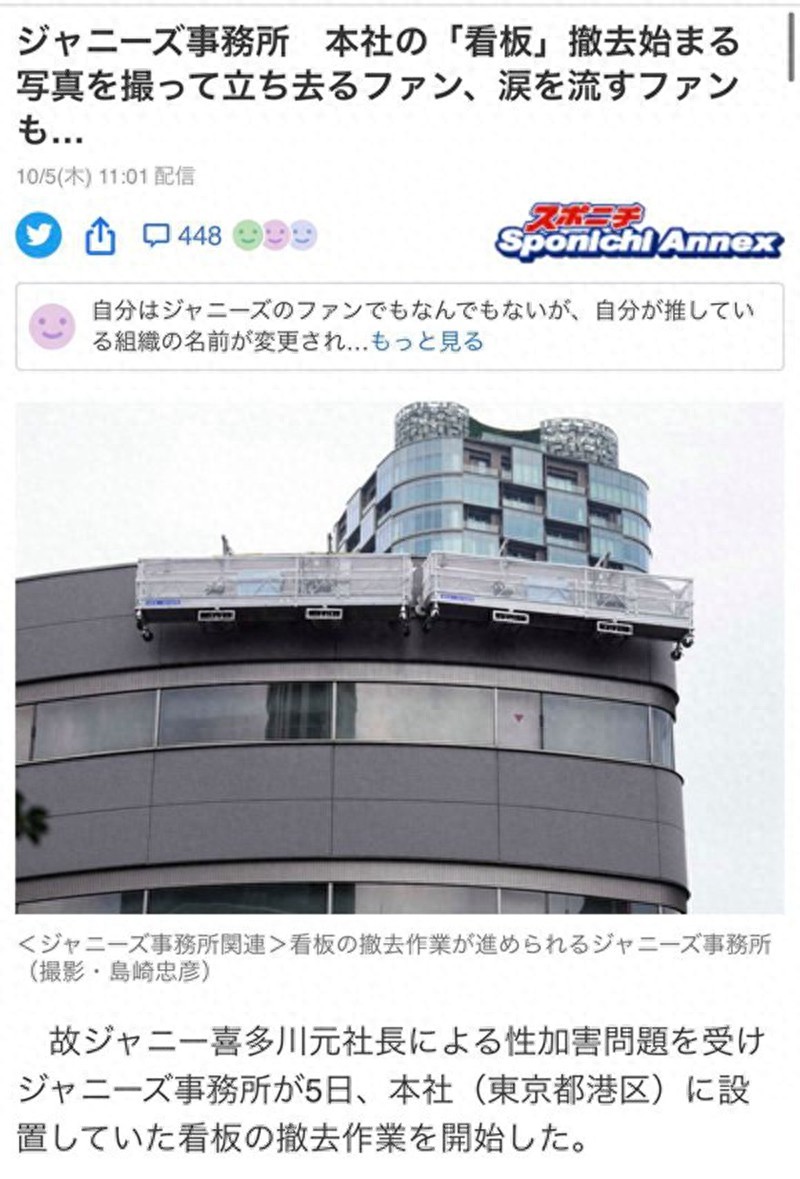 这栋壮观的大楼是2016年建立的,之前杰尼斯事务所一直在一栋不起眼的小楼里办公。把招牌取下来,就意味着成立了将近50年的杰尼斯不存在了,虽然事务所仍在运行,但因为不叫杰尼斯,所以一个时代落幕了。