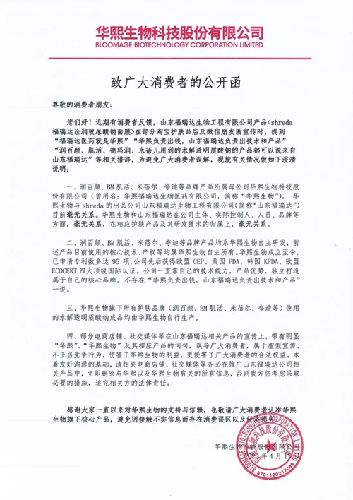 4月17日,华熙生物科技股份有限公司(下文简称:华熙生物)的官方微博发了一条“怒怼“山东福瑞达生物工程有限公司(下文简称:福瑞达美业)的《致广大消费者的公开函》。