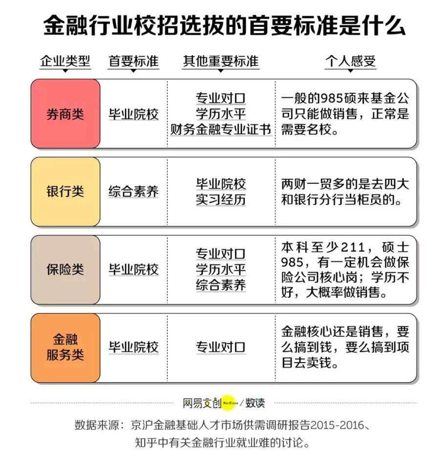 很多金融公司招聘不限专业,一方面是因为很多岗位对应届生的财经知识要求不是那么高,比起专业,学校和经历更被看重;另一方面也是因为金融行业越来越看重复合型人才。比如“环化生材”专业,因为科研难、就业难,经常被人劝退。但如果搭配读一个金融方面的研究生,他们既懂金融,又懂技术,反而会颇受金融行业中“行业研究员”岗位的青睐。同理,也有不少医学、电子等其他专业的同学,因为金融行业的高薪、本专业就业难等原因,通过这个方式冲了进来。我就遇到过一个本科在吉林大学读化学,硕士在清华读的金融的个例。