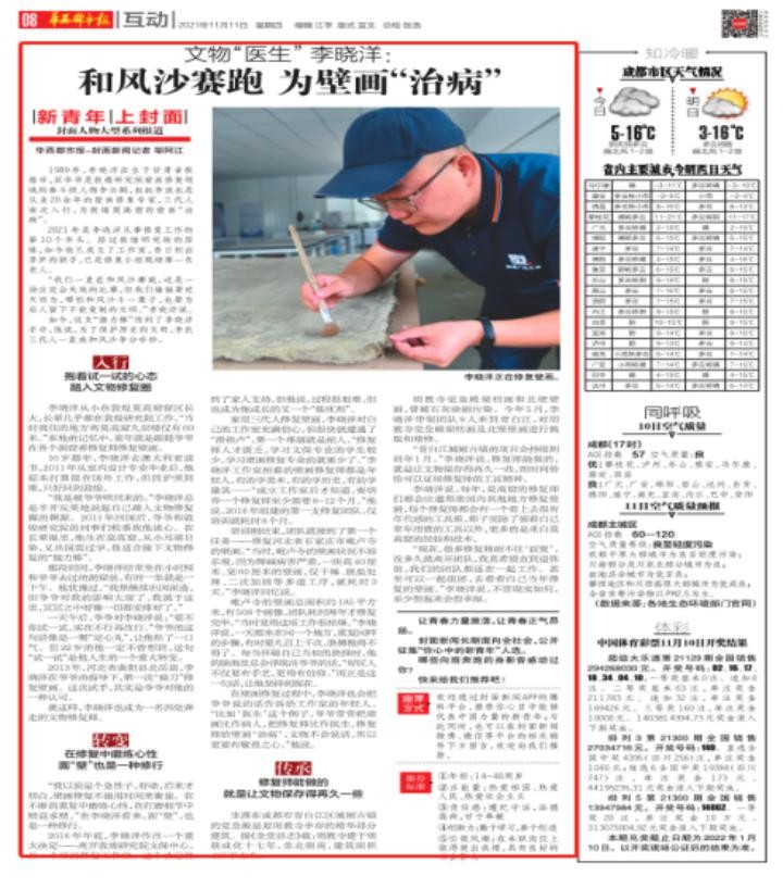 11月11日,《华西都市报》A8版头条(2/3版)以“和风沙赛跑 为壁画‘治病’”为题,报道了壁画修复师李晓洋带领团队为城厢古镇明教寺觉皇殿进行修复工作等相关情况。