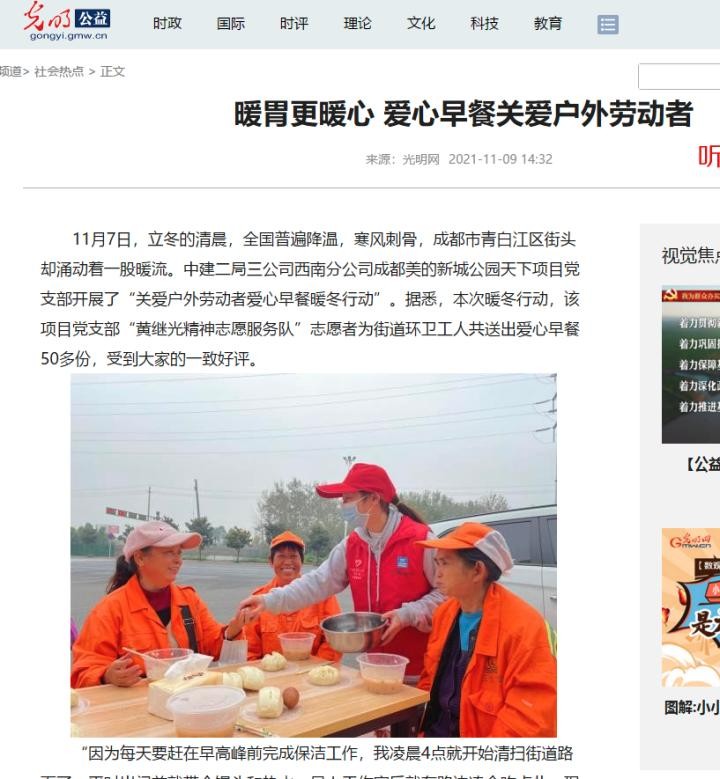 11月10日,光明网以“关爱环卫工人 企业爱心早餐暖胃更暖心”为题,报道了中建美的新城公园天下项目党支部开展“关爱户外劳动者爱心早餐暖冬行动”,为我区街道环卫工人共送出50多份爱心早餐等相关情况