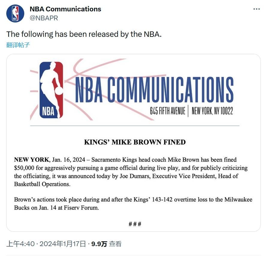 北京时间1月17日,NBA常规赛继续进行。在今天早些时候,NBA官方宣布,国王队主帅迈克-布朗因在比赛中与裁判发生冲突以及公开指责裁判罚款50000美元。