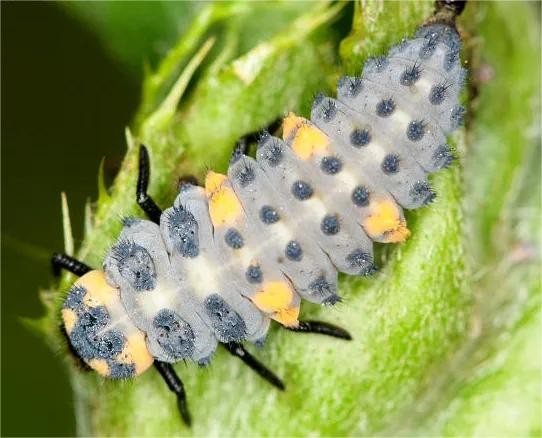 七星瓢虫幼虫体表有一层较坚硬的表皮,它的伸展性有限,所以生长到一定阶段,必须蜕去老皮,着生新皮,才能继续成长。每蜕一次皮,就增加一个龄期,幼虫共蜕三次皮,有四个龄期。初孵幼虫(一龄)身体很小,只有2-3毫米,孵化后,就聚集在原卵块的残壳上,约经8-12小时,开始分散取食。约两天后,蜕皮变为二龄,此时体长已增大一倍多,腹部第一节背面两侧,出现两个黄色肉瘤,三龄幼虫除体长加大外,腹部第一、四两节的背面两侧,各有一对黄色肉瘤,但第四节的肉瘤不很明显,要用放大镜才能看清楚,到四龄时,这两对肉瘤都非常明显。当幼虫老熟时,体形变粗,最后以尾端固着在植株等附着物上,准备化蛹。