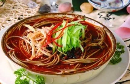 荞面、高粱面制品。将面和好,用河捞床压入沸水中煮熟,加菜、佐料食用。