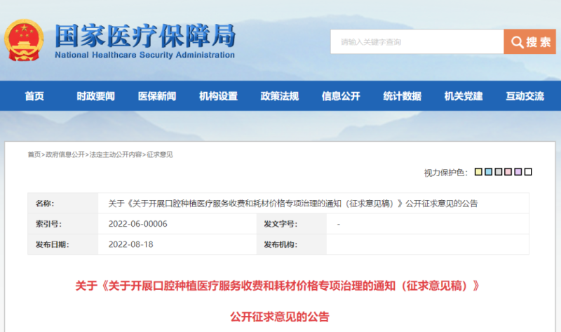 《关于开展口腔种植医疗服务收费和耗材价格专项治理的通知(征求意见稿)》