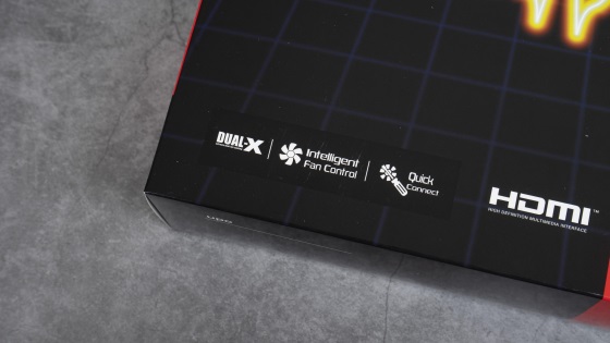 左下角表明白金版经典的DUAL-X风扇,支持智能控制和快速拆装,不看测试可以提前告诉大家,前者代表着安静,后者代表着便利,四个字可以概括这款RX 560XT风扇的特性。
