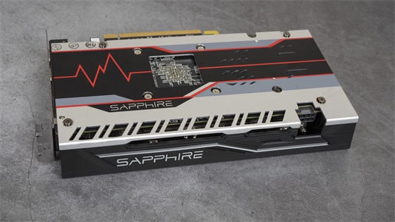 RX 560XT 白金版的金属背板,作为千元以下的显卡能配置算良心了,条纹跟随着白金版的包装是一条红色的生命线设计,黑色的加入证明了红和黑是永恒搭配的硬道理,不至于单纯“白金”配色那么单调。