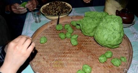 再把拌好的米粉放到锅里蒸,蒸熟之后,倒出来,放在砧板上揉,这个时候,艾果的颜色就出来, 艾放得多,颜色就深,艾放得少,颜色就浅点。