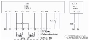 按上、下图示接法:若按下外部急停按钮,后K11失电,那么即使复位外部急停开关后,即输入回路已经有电,但是还必须按控制箱190SP1上的故障确认按钮后,K11内部继电器才吸合得电。