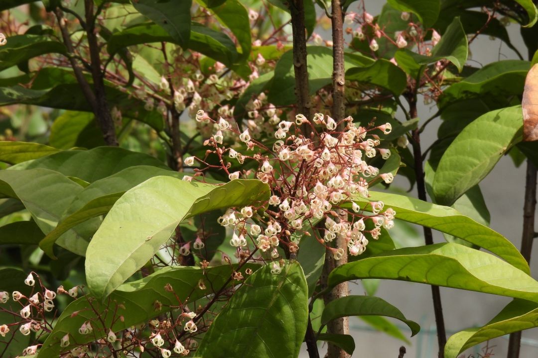 三是圆锥花序,柔弱披散,长达20公分;花萼初为乳白色,后转为淡红色,钟状,5裂,裂片披针形,先端内卷;无花瓣;雄花比较多,花药黄色,雌花比较少,稍大,4-5月开花,但少数植株在10月左右有二次开花现象;