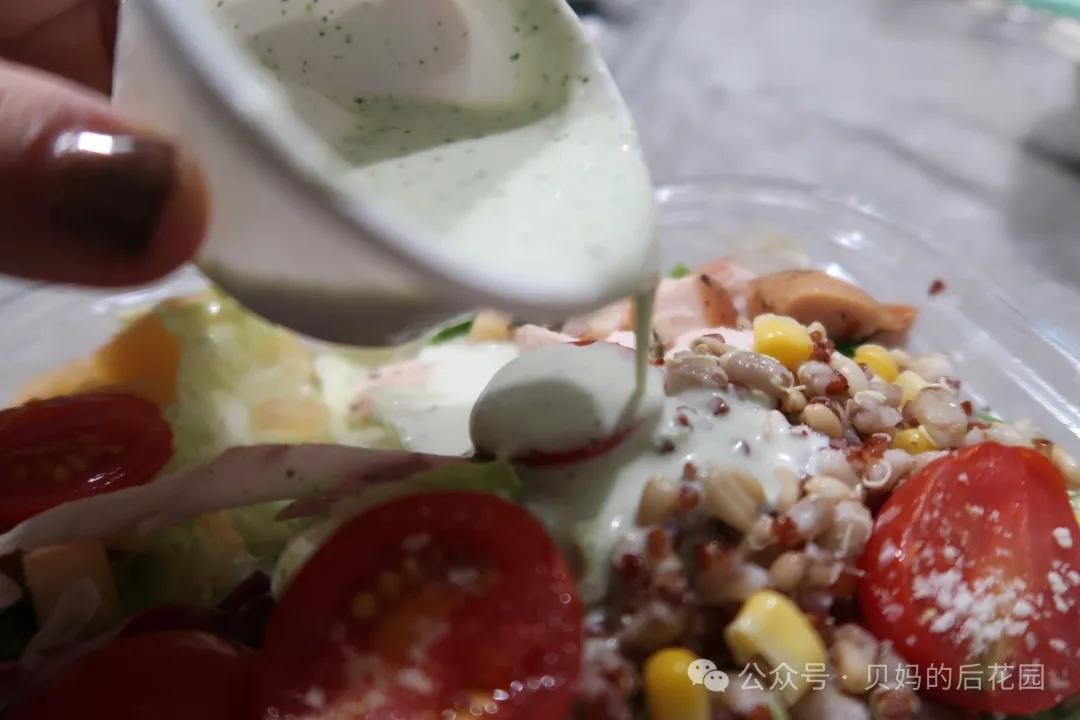 特色配酱是『酸奶薄荷酱』,酸奶流动性强,跟配菜拌一起,吃进嘴里如清风拂过,带些薄荷口感。确实有一丢丢特别。大家可以拌一小部分试吃看看。如果不拌酸奶酱,就是(清淡)无味沙拉了。