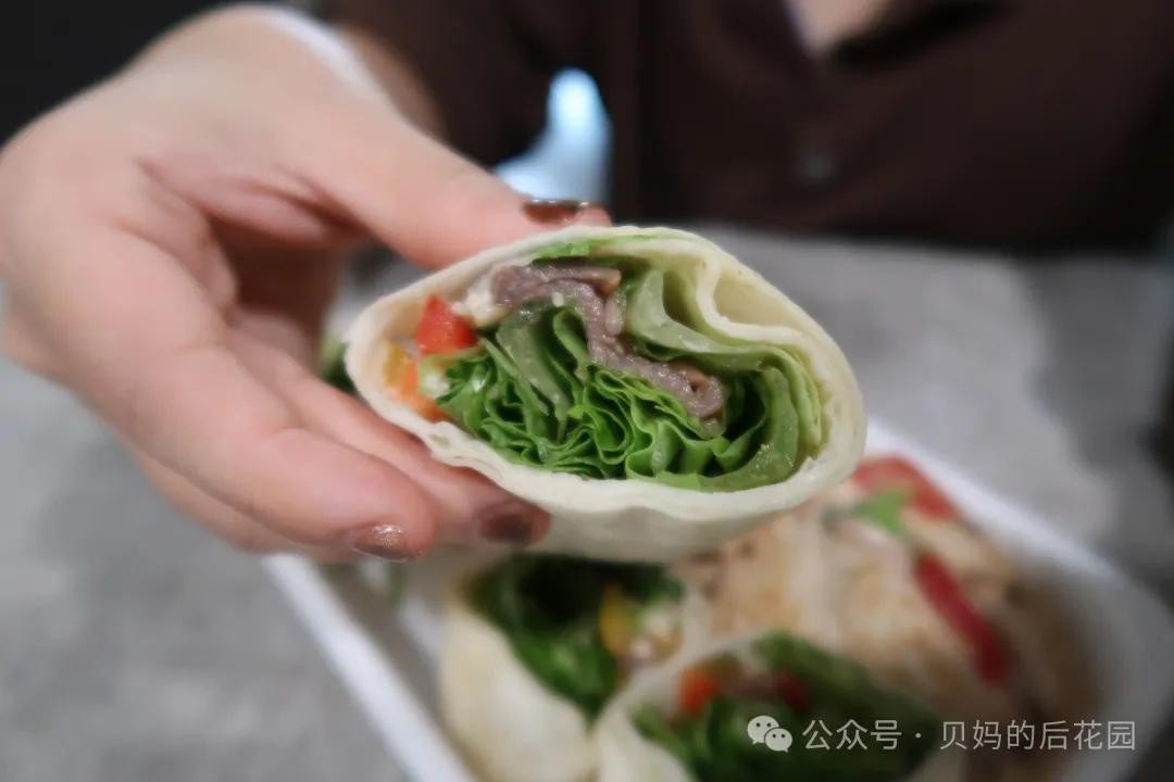 蔬菜牛肉卷,面皮薄软,卷着生菜,番茄,甜椒,培根,薄牛肉等。卷的大小,刚好一口一个,不易漏馅,满嘴清爽!
