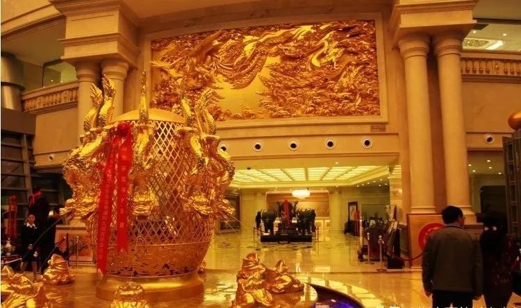 酒店内雕梁画栋,金碧辉煌,说是皇帝的金銮殿一般似乎也毫不为过。2011年,华西村为了迎接建村50周年的盛大庆典,投入3亿元人民币,打造了镇楼之宝—一头国家级的金牛“巨物”,重达1吨,通体泛着金光的纯金金牛。看着这头硕大无比、牛气冲天的纯金金牛,在场的嘉宾恨不得提前准备一把小刀,然后偷偷刮下一小片。