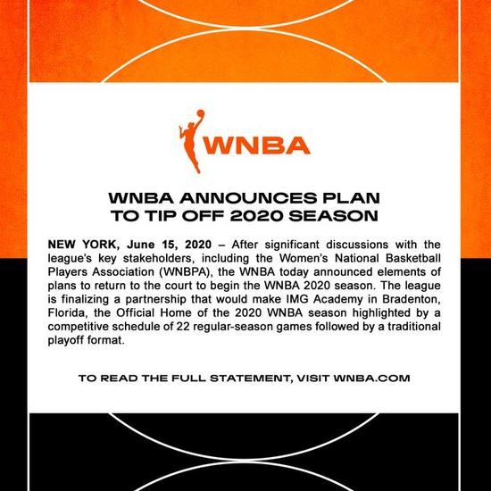 据美国媒体报道,WNBA官方北京时间6月16日发表2020赛季开启声明,比赛将在7月进行,有12支球队参加,地点仍在佛罗里达,所有比赛将空场进行。