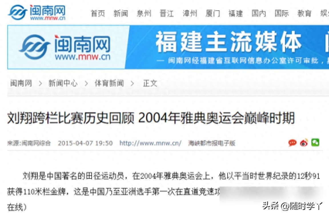 2004年雅典奥运会,刘翔以13秒中的成绩获得110米栏冠军,同时打破了世界纪录,被誉为“亚洲飞人”。