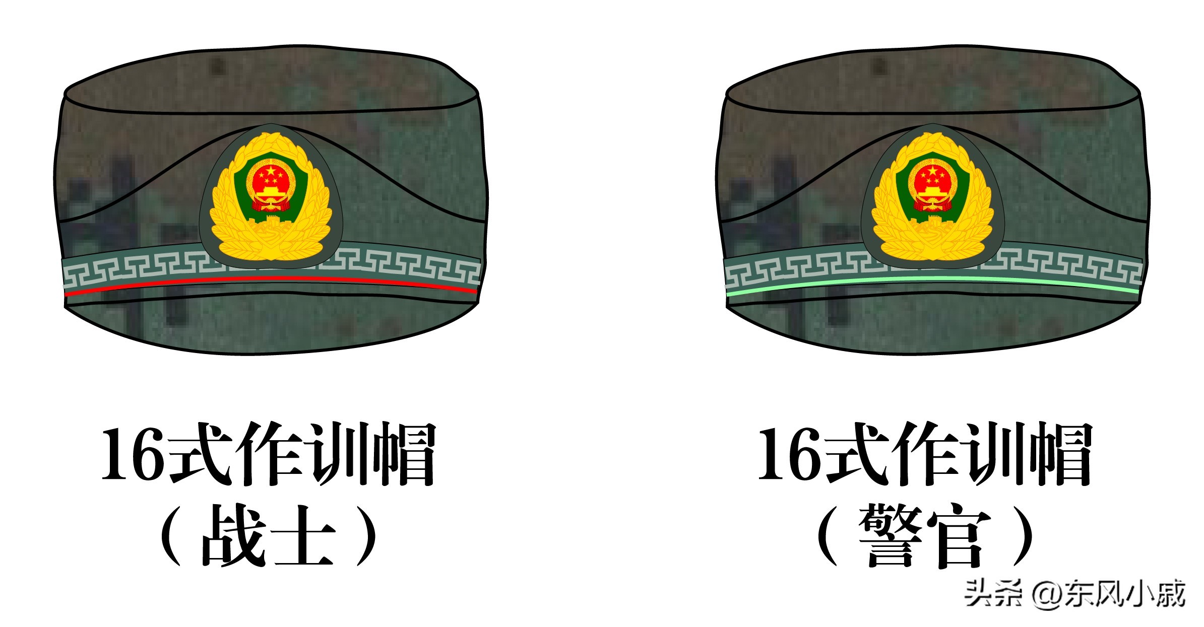 这张图就可以看出战士和警官的作训帽上面的区别,同样的帽带花纹装饰下的线条颜色不一