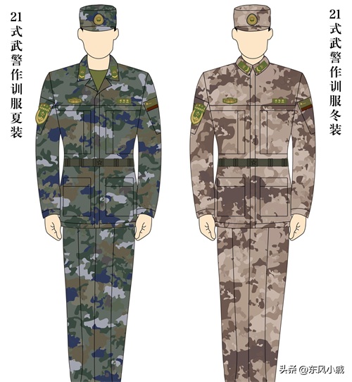 2020年12月开始,中国人民解放军和中国人民武装警察部队开始陆续换装新式制式作训服,解放军装备星空迷彩21式作训服,武警部队装备水墨云迷彩的21式作训服,此次迷彩作训服采用低可视度处理,包括警衔、胸标、臂章