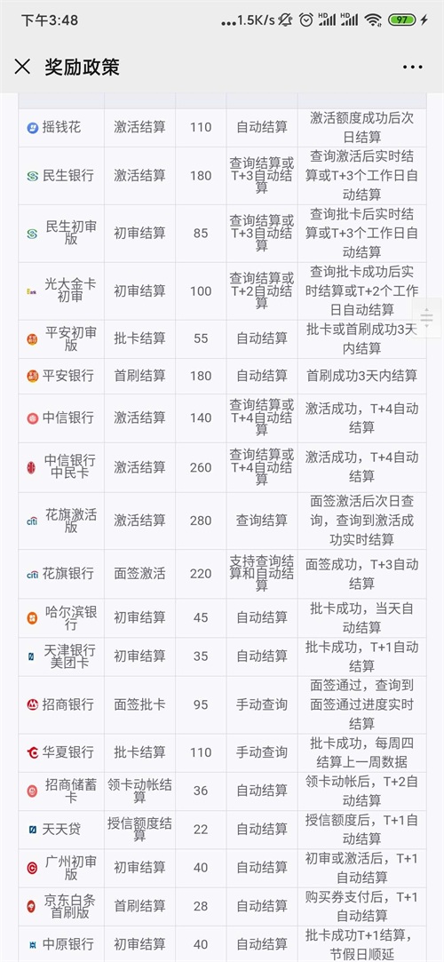 “自动结算”就是客户提交申卡资料,银行审核通过并将数据反馈给申卡新世界,就自动结算批卡佣金;“初审结算”就是客户收到成功核卡的短信,就可以结算佣金了;“查询结算”就算客户拿到了卡并使用,如果不查询进度的话,佣金也不会结算,所以如果是需要查询结算的,一定要和客户沟通查询进度问题,如果客户不愿意给验证码,可将链接发给客户,让客户自己查询进度。其它还有“T+X结算”字样的,X代表工作日,周六、周日不结算。