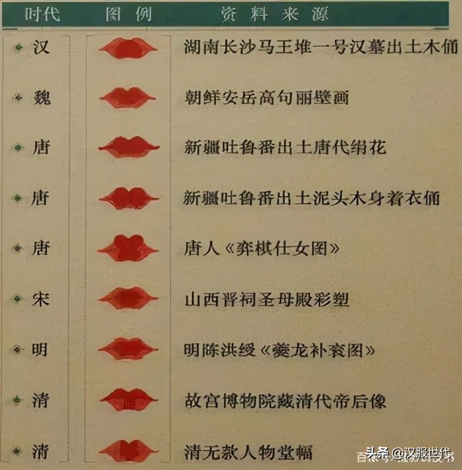 从牛河梁红山文化彩塑女神头像我们可知在红山文化时期已经出现唇部涂朱的现象,经碳十四方法测定其年代距今约5000-5500年。经由很多传世的上木绘俑像或绘画中我们得以窥探历代妇女唇妆式样。像湖南长沙马王堆一号汉墓出土的汉彩绘木妇女俑,新疆吐鲁番出土的唐代绢画妇人像,唐人书卷奕棋仕女,故宫博物院藏宋元明清历代帝后书像,及山西太原晋祠圣母殿宋塑宫女像等等,其点唇式样都各不相同。