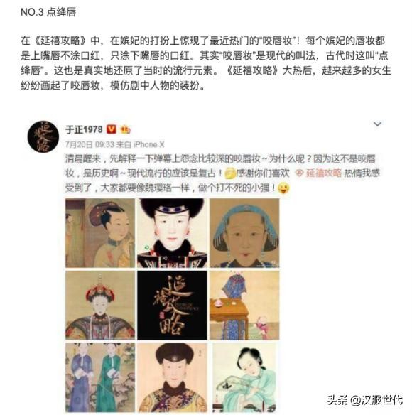 从历史方面来看,现有记录中也未曾记录过“点绛唇”这一唇妆样式。所谓的“点绛唇”唇妆只是大家一直以来的误解和营销号杜撰的。可以明确的是,目前能够找到的历史资料中未曾记录过“点绛唇”这个妆容。至于《延禧攻略》中的唇妆是否真的复原了清代妆容这个问题我们不做探讨。