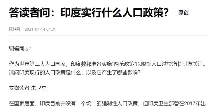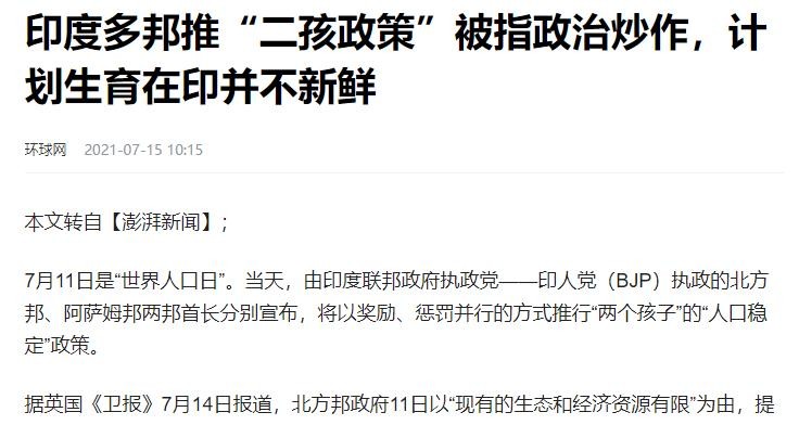 以上信息来源:环球网2021年7月15日“印度多邦推“二孩政策”被指政治炒作,计划生育在印并不新鲜”