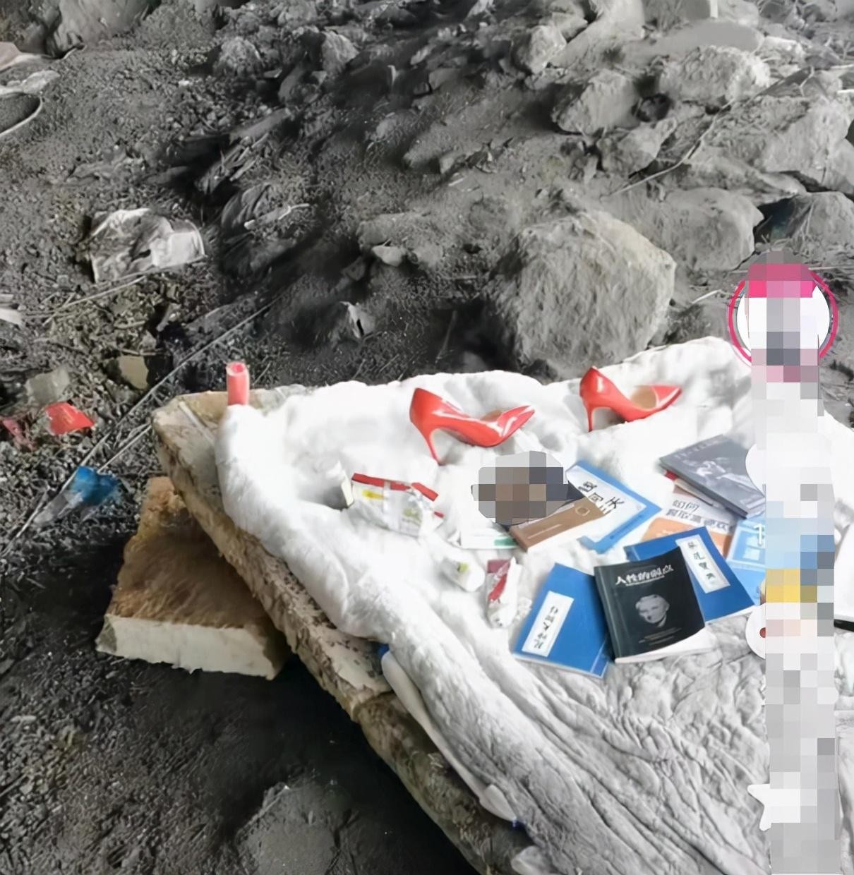 一个已经不再白皙的棉被铺在用石头搭起来的平面上,还放着几本书和一些杂物,这多样的居住环境不免让人有些唏嘘,看上去到处都是脏乱差。