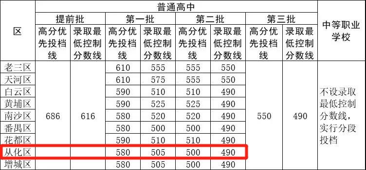 经市中招工作领导小组研究批准,现将2019年广州市高中阶段学校招生各批次录取最低控制分数线予以公布:
