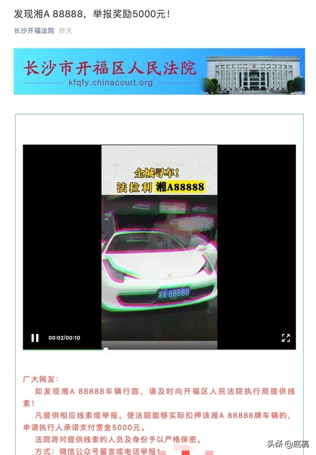 3月2日,湖南省长沙市开福区人民法院发布了一则消息,广大网友如发现车牌号为“湘A 88888”的法拉利车辆行踪,请及时向开福区人民法院执行局提供线索,若使法院能够实际扣押该车辆的,申请执行人承诺支付赏金5000元。
