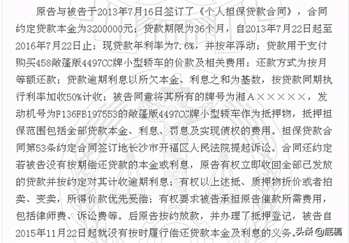 据长沙市开福区人民法院介绍,2013年7月,该车车主周某某与平安银行股份有限公司上海某支行签订了一份《个人担保贷款合同》,合同约定贷款本金为320万元,期限为36个月,贷款用于支付购买法拉利458敞篷版4497cc牌小型轿车及相关费用,并约定了相关利息,还款方式为按月等额还款。