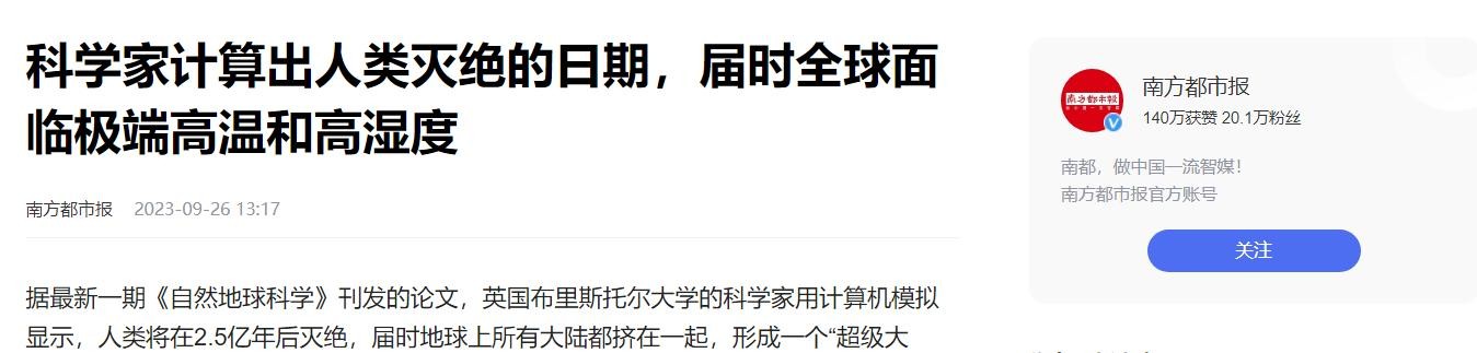 科学家计算出人类灭绝的日期,届时全球面临极端高温和高湿度——南方都市报 2023-09-26