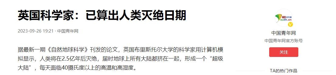 英国科学家:已算出人类灭绝日期——中国青年网 2023-09-26
