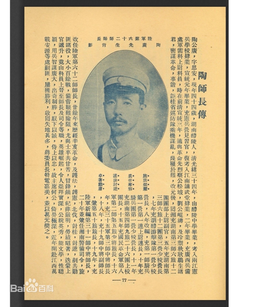 在反帝反清革命风暴的影响下,陶广决定投身革命,先是就读于北京宪兵学校,后考入江西讲武堂,毕业后,在蔡锷部下当参谋。后回湖南,在程潜、唐生智等部下任职。