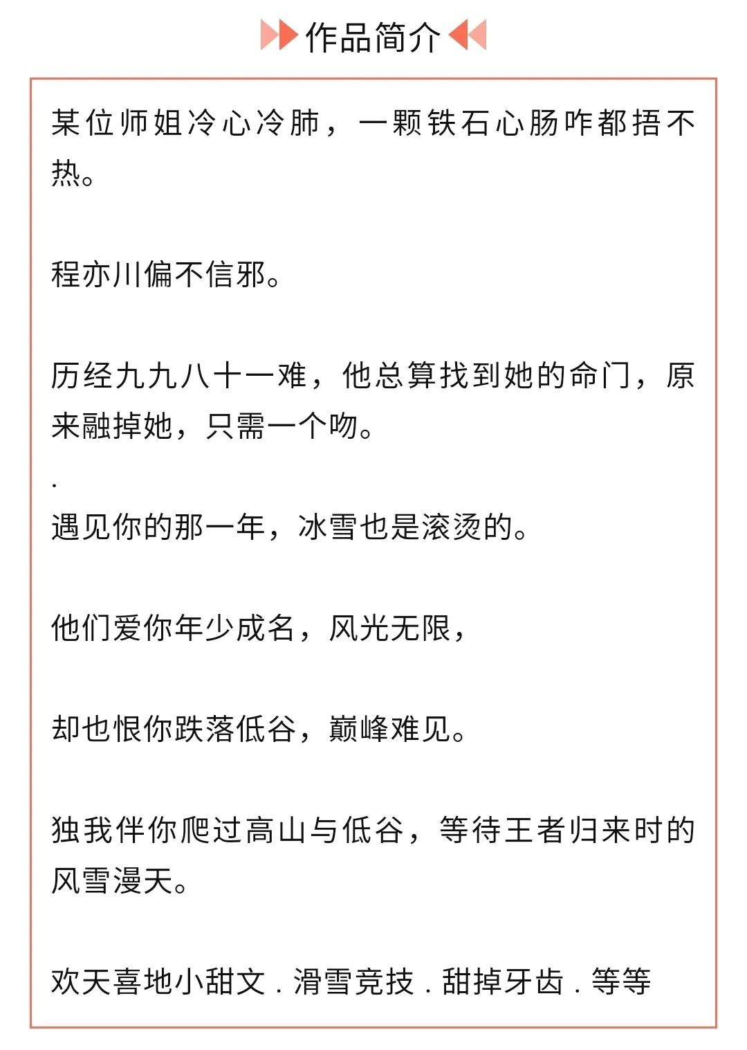 超级好看,巨好看,没看过的快去看,这是一篇较为励志竞技文,作者在感情上描述很细腻,男主就是那种又可爱又卖萌的小狼狗。就是结尾感觉有点突然,但是该交代的都有交代,不影响什么。慢热小甜文,女主是沉稳拼搏的滑雪选手。男主是活泼阳光自恋有天赋的滑雪选手。女主比男主大6岁。女主因母亲而妥协放弃滑雪,但没料到差点惨遭职场潜规则,男主得知她因此事离职后立马去安慰女主,带她治疗腿伤。女主因此重新走向赛场,慢慢被男主感动!虽然女主最后还是没拿到世界冠军,但始终保持着从容大气!强推!