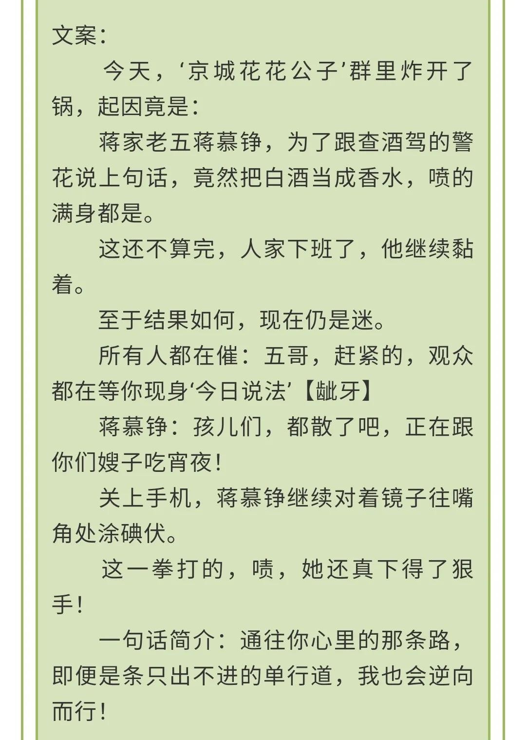 【短评】女主洛飒是个外强内柔的交通警察,身为富二代,却喜欢在无纷争的交通警察岗位上服务,不喜与人争,不屑与人斗,从9岁父母离婚后就被迫独立一人生活,内心极度渴望被爱。男主蒋慕铮颜值智商都在线,有不为人知的辉煌过去,是京城有名的钻石王老五,不是不爱,只是没有遇上合适的她。两个毫无关联的两人,却因一次次误会与巧合,让两人走近,互相了解,互相吸引。