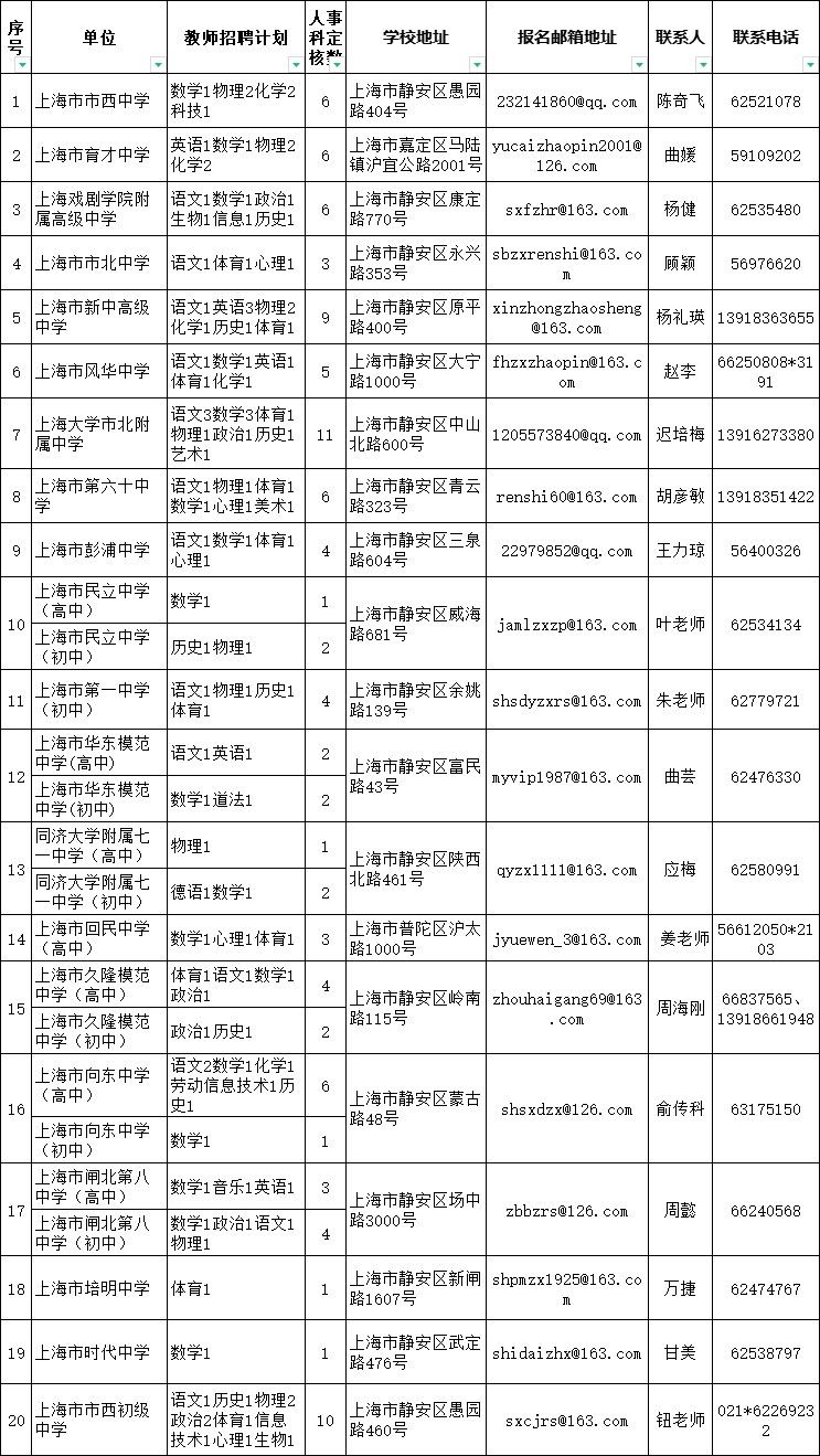 http://www.jajyrc.edu.sh.cn/),各学校网站查看招聘岗位、报名联系方式等信息。