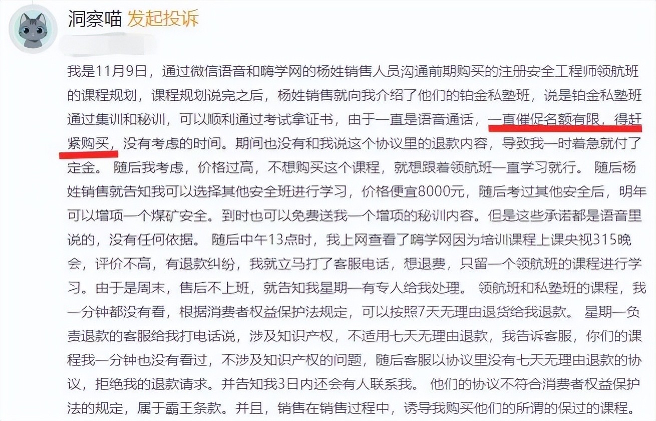 但记者在浏览黑猫投诉等平台后发现,和焦先生、高女士有相似经历的消费者不在少数。这些投诉大多是围绕嗨学网使用“顶级名师”“密押题”“超高通过率”等话术和以“不过包退”“价格优惠”“名额有限”等为由诱导消费。