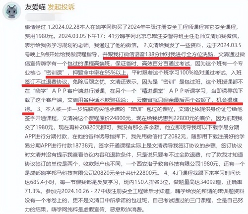 一位消费者在黑猫投诉平台上表示,嗨学网工作人员诱导缴费时承诺必过,宣称提供内部资料、不过包退,但结果考试未过、内部资料也没有按照承诺发放,甚至对接业务员还“跑路”了。另一位消费者则反映,为备考一级建造师证书考试,先后花费2980元和15800元报名嗨学网课程,工作人员通过频繁联系、人为制造焦虑和虚假宣传等手段,承诺考不过包退费。但实际培训效果与宣传相差甚远,考试未通过后,沟通退费事宜长达约1个月,嗨学网坚决不同意退费。