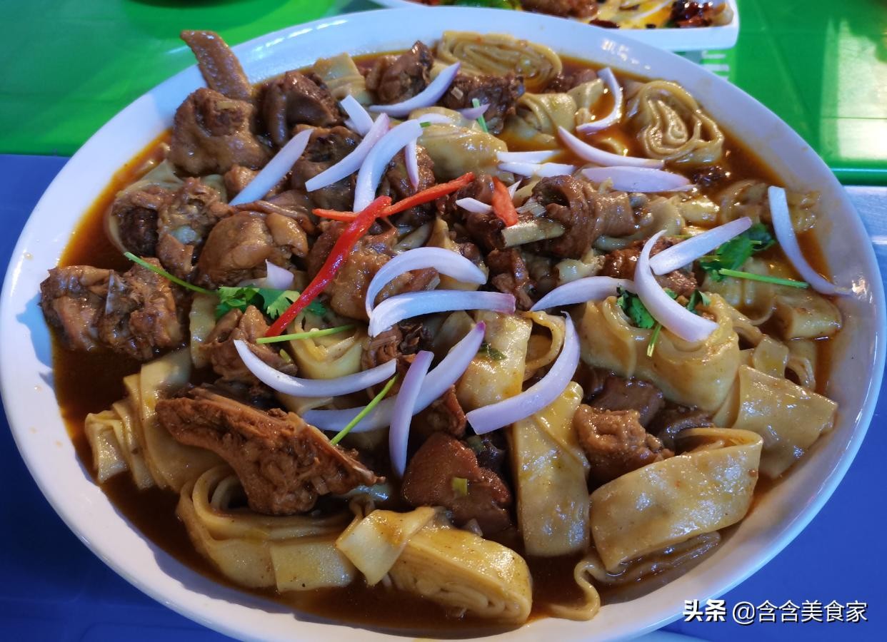 张掖卷子鸡是本地的特色美食,味道独特深受大家喜欢。卷子鸡也叫鸡肉垫卷子,卷子鸡可以说是西北面食与菜肴的融合,和大盘鸡一样同样也是超级大份,鸡肉就是炖的那种鸡肉,不柴很嫩但也不算很多汁的那种!卷子是用面皮卷起来做的,很劲道爽滑而且泡在汤汁里,很入味!