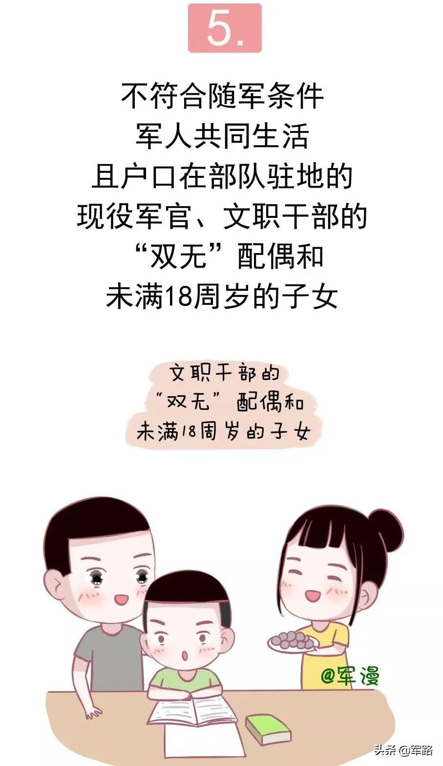 已故离休干部配偶、随军家属、符合随军未随队家属、随队家属、遗属、代管家属、代管家属(优惠)、代管家属(免费)、牺牲病故军人配偶子女、驻藏家属(3000米以上)、建国前参加工作、55年前后复员女同志。