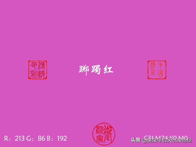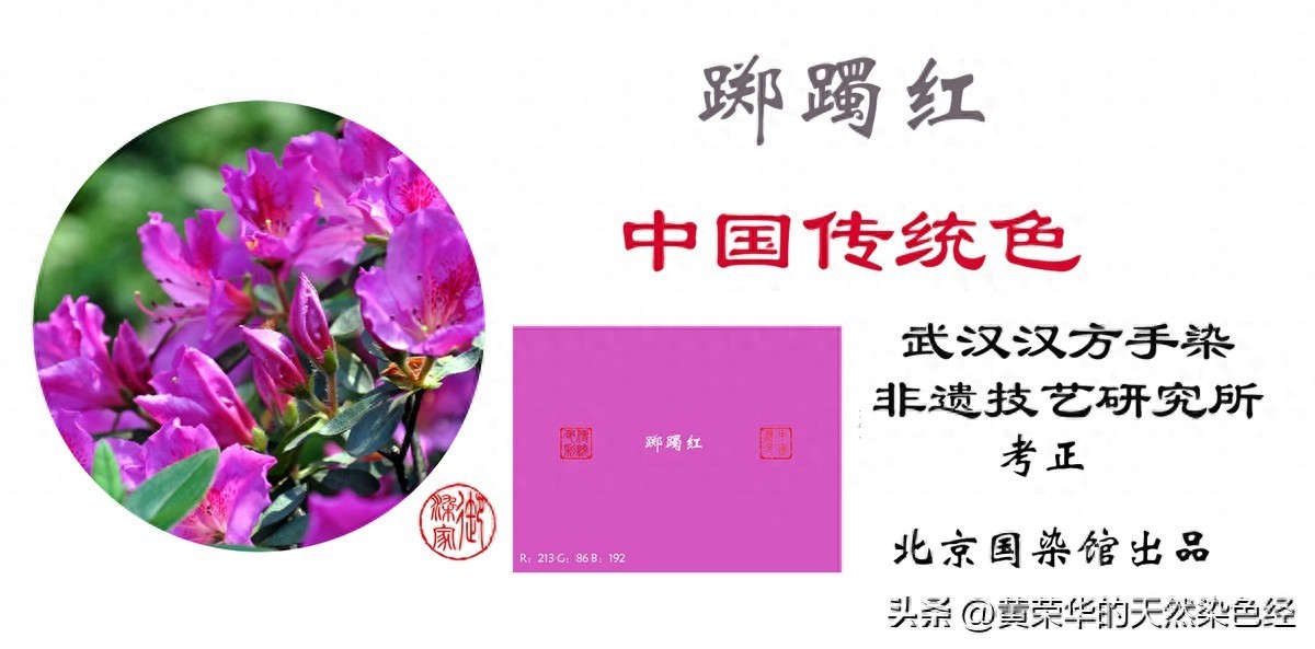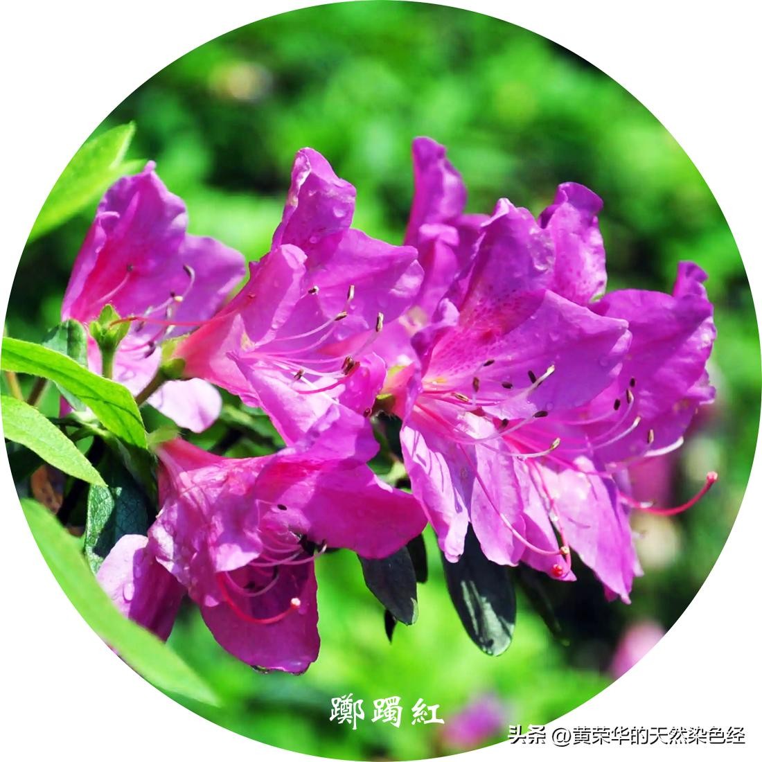 踯躅红,就是这种紫红色的杜鹃花的颜色。染这个颜色可用苏木提取染液,加少许小苏打,调整到弱碱性染色三十分钟,清洗即可。当然使用紫胶红加明矾也可染出踯躅红来。