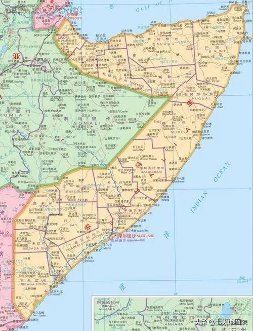 地形地貌:索马里的地形地貌具有以下特点:海岸线:索马里拥有非洲最长的海岸线之一,海岸线长3200公里。地形特征:东部沿海主要是平原,沿岸有众多沙丘。中部地区主要是索马里高原,海拔在500米至1500米之间,地势自北向南和东南逐渐下降。北部地区多山。西南部地区则主要是草原、半沙漠和沙漠地带。最高峰:苏拉德山海拔2400米,是索马里全国最高峰。气候:索马里大部地区属于亚热带和热带沙漠气候,西南部则属于热带草原气候,终年高温,干燥少雨。河流:索马里的河流较少,除了南部的谢贝利河和朱巴河,其他河流多属于间歇性河流。行政区划:根据2012年的临时宪法,索马里可以由两个或多个州自愿合并组成联邦成员,2016年共形成6个联邦成员州。索马里的地形地貌多样,从沿海平原到高原、山地再到沙漠地带,这种多样性为索马里提供了丰富的自然资源和多样的生态环境。然而,由于干旱少雨的气候条件,索马里的农业发展面临一定的挑战。气候类型:索马里的气候类型主要包括热带沙漠气候和热带草原气候,具体特点如下:热带沙漠气候:主要分布在索马里的北部和沿海地区。终年高温干旱,年平均气温可达28~30℃。年降水量非常少,大部地区年降水量在200~300毫米,北部山地稍多,可超过500毫米。植被覆盖差,土壤侵蚀严重。夏季受东北信风和季风洋流影响,增温增湿;冬季则干燥少雨。热带草原气候:主要分布在索马里的西南部内陆地区。气候较为温和,降水量较沿海沙漠地带为多,年降水量在500毫米左右。有明显的干湿季之分,湿季多雨,干季干旱。植被以草原为主,有小片森林分布。季风影响:索马里地处北印度洋,受季风影响明显。夏季(5-10月)受西南季风影响,气候炎热干燥,沿岸形成索马里寒流,加剧干旱。冬季(11-4月)受东北季风影响,气候较为温和,但降水依然不多。洋流作用:索马里洋流具有季节性变化,夏季为寒流,冬季为暖流。夏季寒流对沿岸气候有降温减湿作用,加剧干旱。冬季暖流对气候影响较小,气候依然干燥。地形影响:索马里地形以高原为主,海拔多在500-1500米。高原地形对气候有一定影响,山地降水相对较多。干旱问题:由于终年高温干旱,降水稀少,索马里面临严重的干旱问题。干旱导致植被覆盖差,土壤侵蚀严重,影响农业生产。索马里的气候以热带沙漠气候和热带草原气候为主,受季风和洋流影响明显,终年高温干旱,植被覆盖差,面临严重的干旱问题。