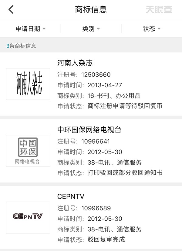 商标注册历史显示,该公司曾于2012年先后申请了“中环国保网络电视台”和“CEPNTV”两个商标,但均被驳回。