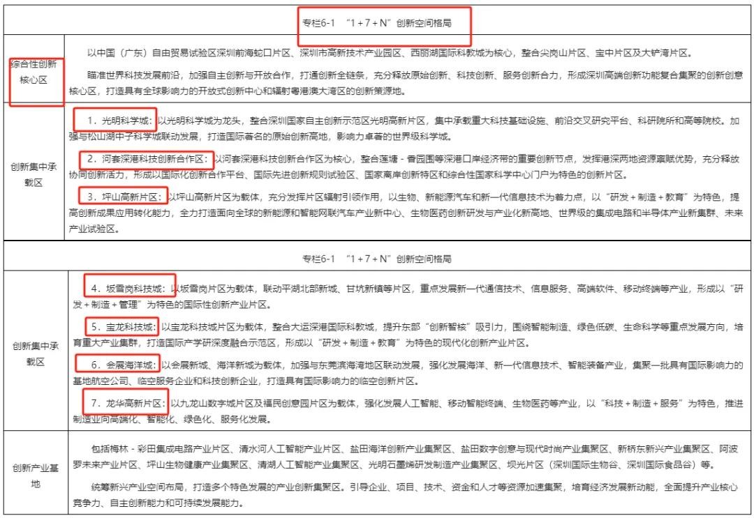 坚持创新驱动发展战略,依托深圳市高新技术产业园区、深圳国家自主创新示范区及市级新兴产业片区,优化形成定位清晰、链条完整、资源集聚的“1+7+N”全域创新空间格局。
