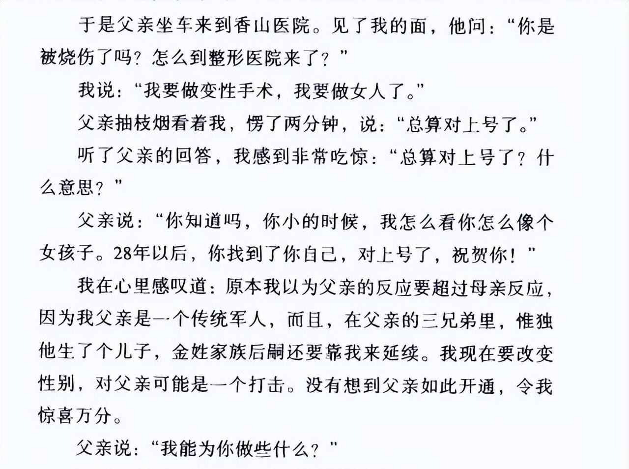 变性对于金星来说不是简单的男变女,更不是为了追求他人的认可和权利,而是他终于找到了自己。他坦荡地分享了变性的经历,也提倡尊重和包容不同的性别和身份。金星的故事告诉我们,每个人都有自己的性别和身份认同,需要被尊重和包容。