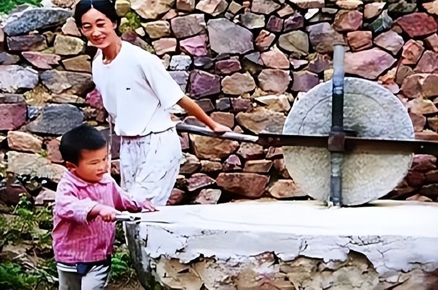 院子里的石磨旁,张梅正在院子里拉磨,小宇在那里玩。
