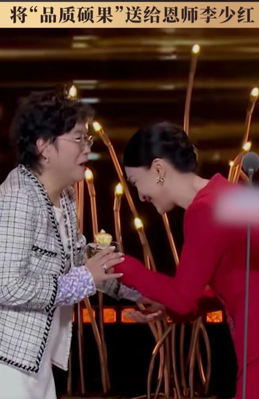说完后,周迅哭着把手中的奖杯送给李少红导演。”并表示一直践行她的教导。