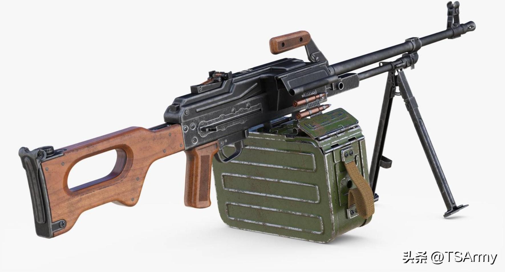 苏军分别在1949年和1959年装备了AK-47和AKM两种突击步枪,尤其是59年采用的AKM型,可靠性极高,故障率也很小,为了减轻步兵班的负重量,再加上当时苏联有了“枪族化”的理念,因此就在AKM突击步枪的基础之上,研制出了一种弹药和零件全部通用的新式机枪。