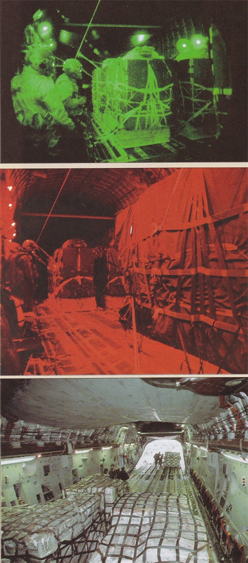图示:空投作业开始,装运员佩戴氧气面罩在后舱进行操作,为防止货舱灯光暴露目标,货舱采用弱光源照明。货物通过铺设在货舱地面的滑轨依次进行空投。